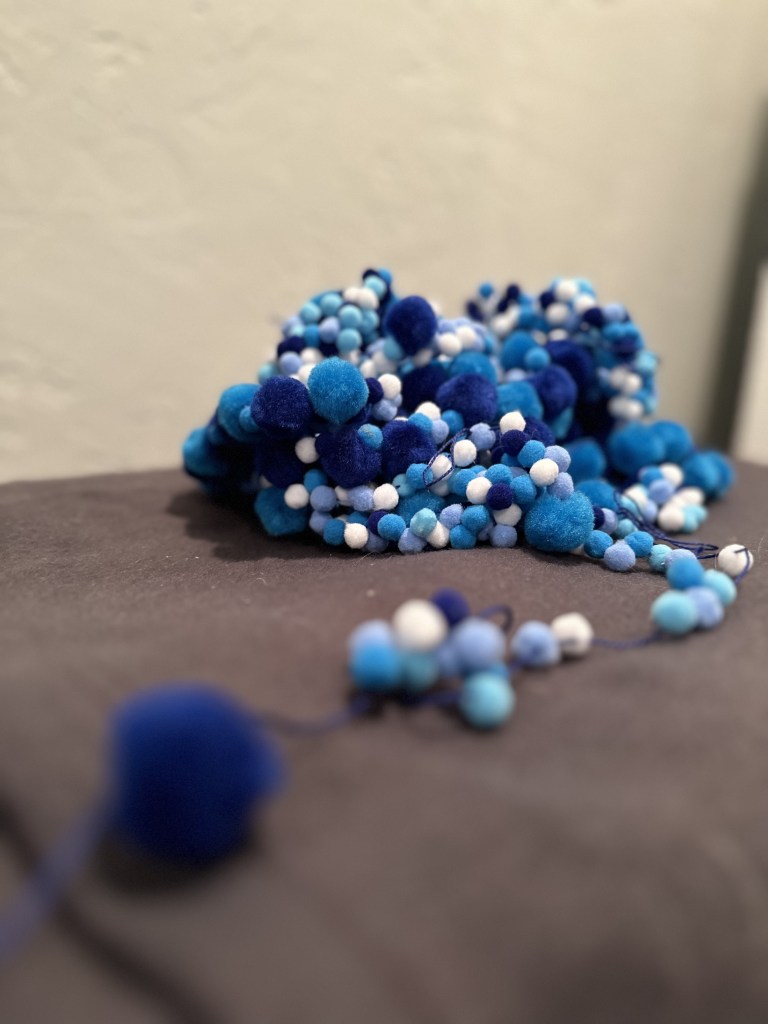 Spent over 15hrs meticulously hand-sewing the pom pom bubbles and endured at least 5hrs of needle pricks while threading the hand painted wine cork necklace. The looks people give when they see this iconic sculpture dressed up …timeless