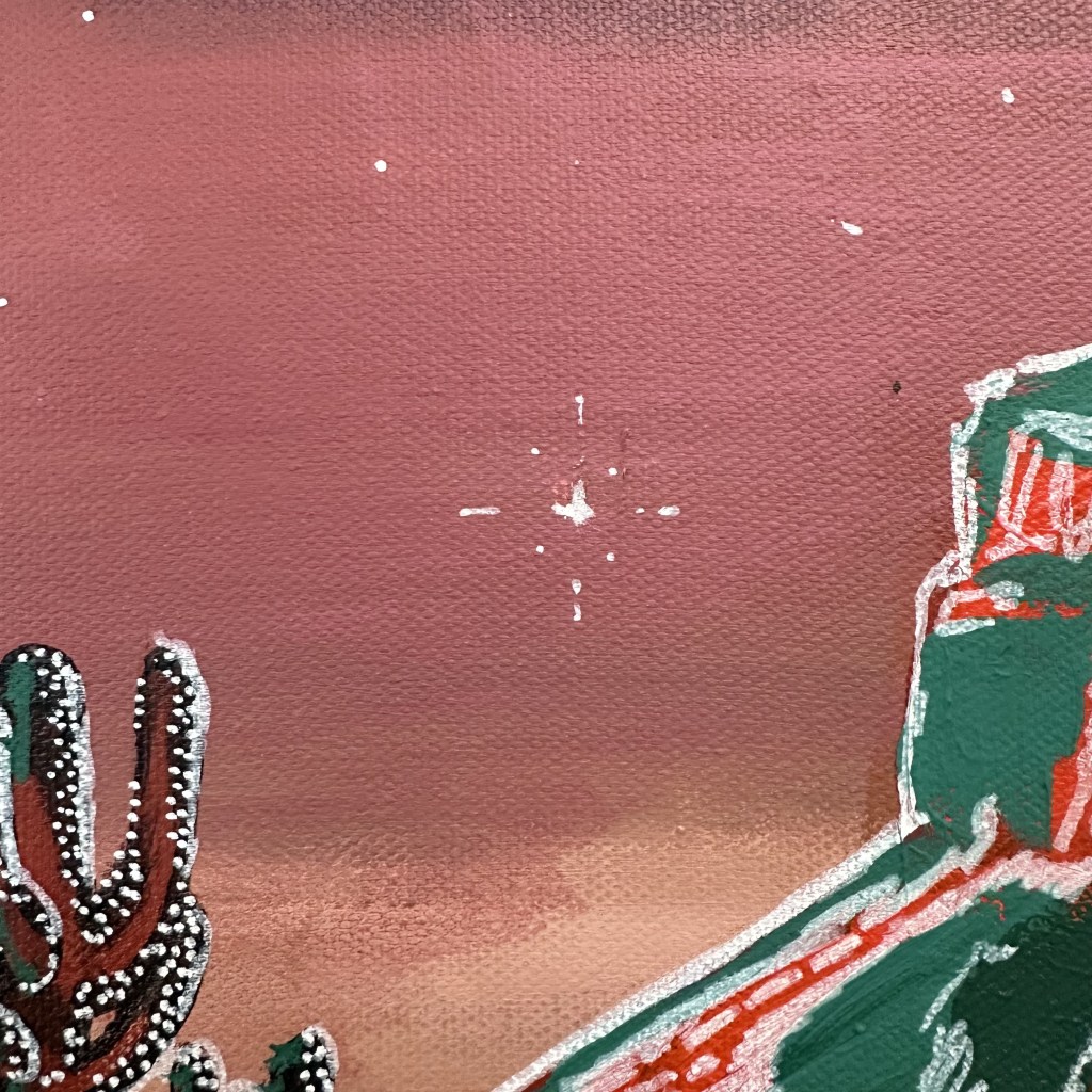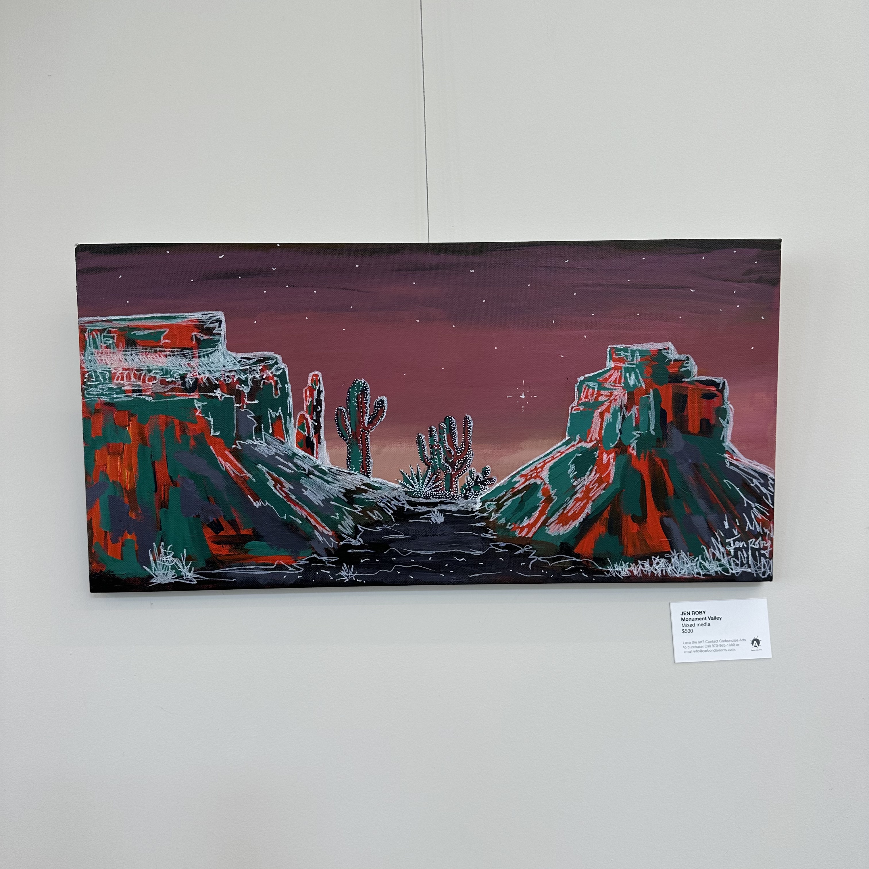 Each piece carries sentimental significance, having been abandoned or discarded in moves, adorned with a small tear that I’ve integrated into each acrylic landscape. The stories behind these canvases may be unclear, yet I sensed their individual tones as I painted across each weathered surface.