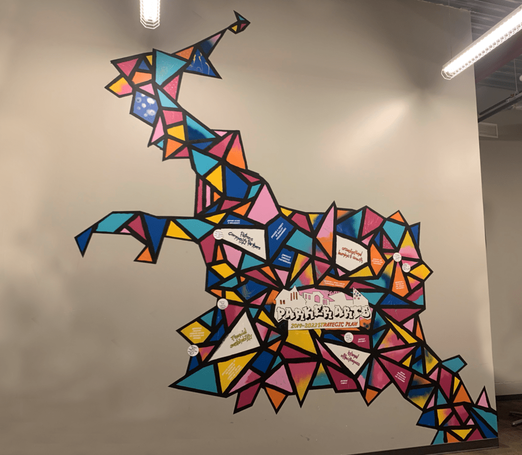 Brief was to design a combination of an infographic and a colorful graffiti piece, where the creative design serves as a backdrop for their Strategic Objectives using added decals. Specifics about the mural: